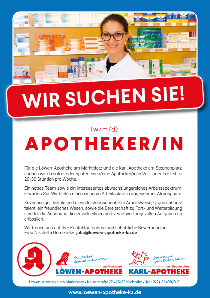 Fort- und Weiterbildungsmöglichkeiten, flexible Arbeitszeiten, ein angenehmes Betriebsklima und moderne Apothekenorganisation sind bei uns selbstverständlich. Wir freuen uns auf Ihre Kontaktaufnahme.